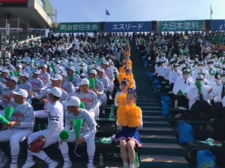 彦根総合高校は大会第5日の3月22日(水)に山口県の光高校と対戦。当日は初夏を思わせるほどの晴天。応援団員たちは額に汗を滲ませながら、彦根総合高校ブラスバンド部の奏でる音楽にマッチした軽快な振り付けを披露し、アルプススタンドを沸かせていました。→新聞記事