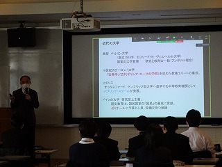後半は、京都大学名誉教授・佛教大学教授の南川高志先生による講義です。イギリス海外研修の研修地であるケンブリッジでの研究経験をお持ちの南川先生には、例年、日本の大学のイメージでは理解しにくいケンブリッジ大学のシステムやご自身の当地での経験等をお話しいただいています。今年は、将来の海外留学に向けて、ケンブリッジ大学だけではなく、ヨーロッパでの留学について幅広くお話しいただきました。