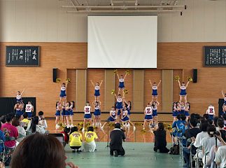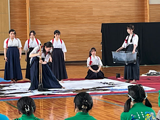 中庭ではギター班が突然の雨の中でも演奏をやり遂げ、吹奏楽班は馴染みある曲の数々で体育館を盛り上げました。続いて登場したチアリーディング班は元気な掛け声とともに演技を開始し、そのパフォーマンスと笑顔に会場からは大きな拍手が湧きました。書道班は「雲外蒼天」の力強い揮毫で、後輩や3年生たちへメッセージを届けました。音楽室ではピアノコンサートが行われ、武道場では体育会系の班員たちがダンスを披露するなど、普段の学校生活では見られない一面を垣間見ることが出来ました。