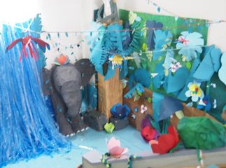 階段や廊下はアーティスト部門担当の生徒たちによる見事な作品で装飾されていました。各ブロックのイメージカラーを取り入れたテーマ構成と、今年度は作品内に仕掛けられた謎解きが特徴です。観るだけでなく「探す」楽しさも味わえる内容で、普段は移動のための階段が、生徒たちの創造力によってアート空間へと変貌していました。部門1位を獲得したFブロックの作品は表情までリアルな動物たちと、葉の11枚まで丁寧に作り込まれた壁面装飾でジャングルの世界を見事に表現していました。階段を上り下りする大変さも忘れてしまうほど夢中になれる展示でした。