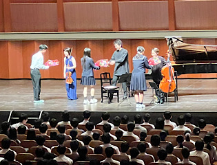さらに特別な企画もありました。在校生の髙木悠さん(3年)が、バッハ「2つのヴァイオリンのための協奏曲」に共演者として参加したのです。演奏を終えた髙木さんは「1,000人を超える観衆を前に緊張もあったが、御三方と演奏できたことの楽しさのほうが大きかった」と語り、「演奏の一体感に驚いた」と振り返りました。リハーサルから当日まで、緊張の中で重ねた貴重な経験を生徒の皆さんに紹介してくれました。