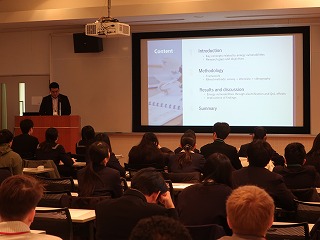はじめに、英語トレーニングおよびプレゼンテーション演示として、京都大学エネルギー理工学研究所のクラビオット・C・ジョルディ先生にこれまで取り組んでこられた研究について、英語でお話しいただきました(講義題『Energy access vulnerabilities in Southeast Asia: A view through quality of life change from solar electrification』)。